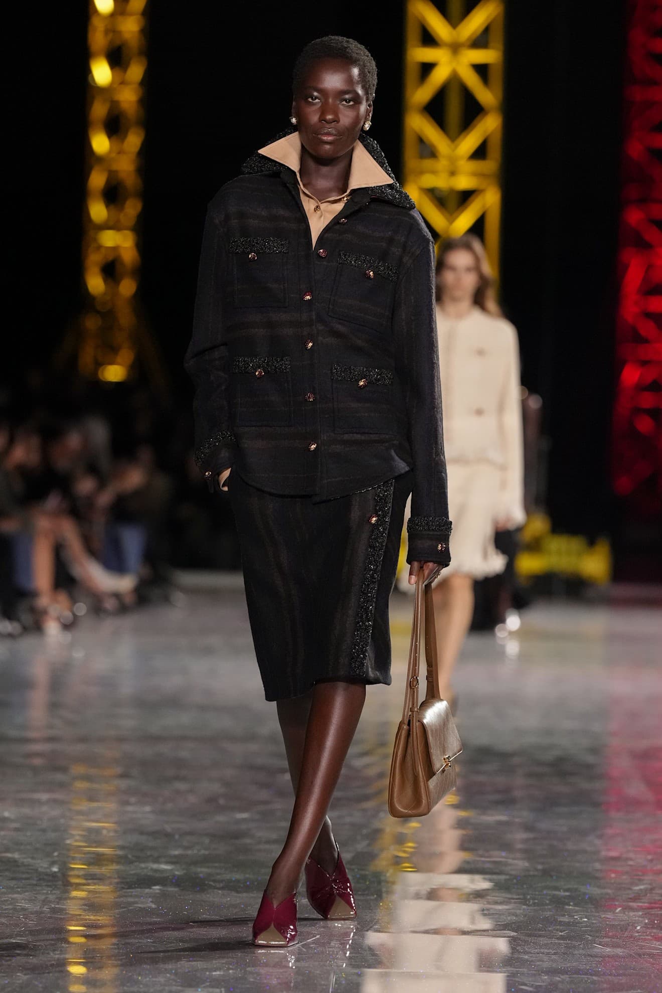 LaunchmetricsWe witnessed this through the two polarities on the runway. First, a procession of classic Chanel suits in black and cream, then daywear in the form of houndstooth bombers and long-line, insouciant blazers with rolled sleeves; these were paired with dresses and faux skirts that gave Chanel’s classic drop-waist silhouette an entirely new meaning, with belts fastened halfway down the thigh and flippy, pleated skirts starting there and ending at the knee, reminiscent of the belted mini skirts at Miu Miu’s blockbuster Spring/Summer 2022 collection.