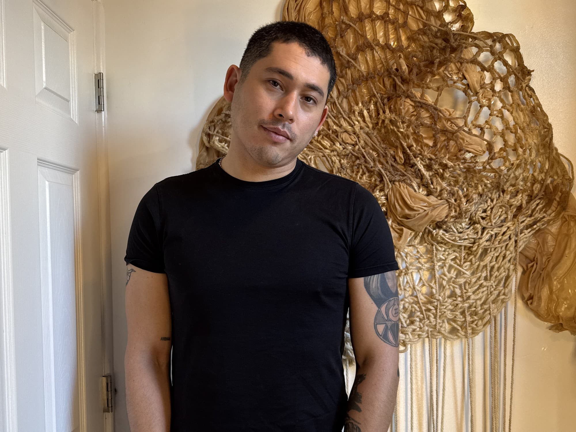 I met Kim Mesches at his Williamsburg home and studio hybrid: a lived-in space filled with light fixtures, garments, and wall art all created by Mesches himself (alongside work by his grandfather, painter and visual artist Arnold Mesches) as well as scraps from old projects patiently waiting to be turned into new ones. This is one of the first things that I noticed about Mesches’s artistry: he is beyond comfortable turning old art into new art. This isn't because he lacks a sense of attachment to his work, but because he is committed to continuously evolving and doesn't beat himself up when something doesn't turn out how he imagined it would. Entering his apartment, one of the first pieces of art that I spot is woven and dyed with coffee. “We experiment out here for the sake of trying shit,” he says. “I love throwing stuff at the wall and seeing what sticks.”