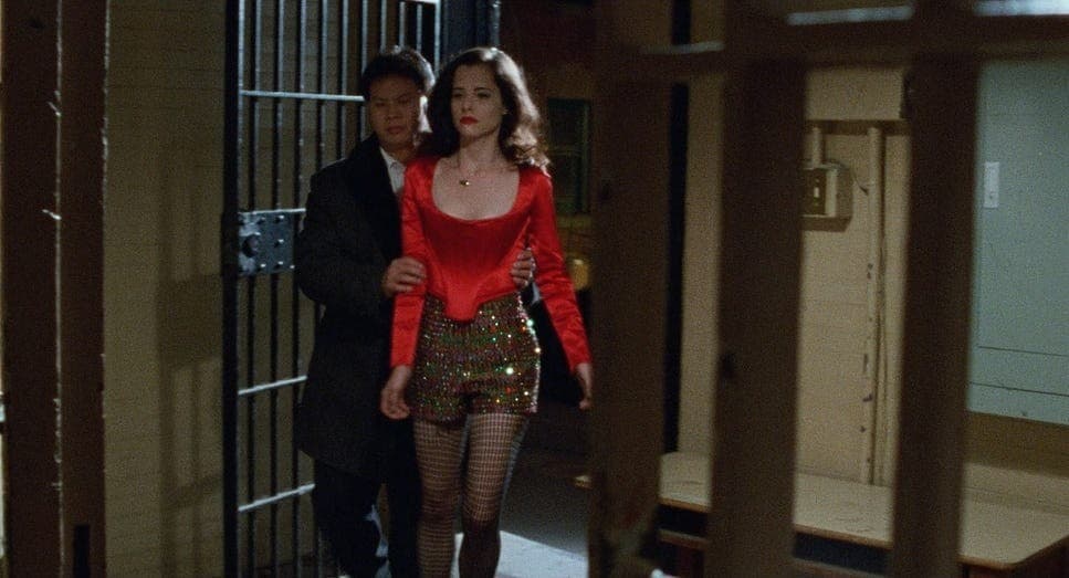Farrell is wistful when talking about old thrift destinations like Domsey’s Warehouse and Canal Jeans. “Even just the Salvation Armies were good. I used to run into Chloë Sevigny all the time at the Salvation Army,” she recalls. One legendary "Party Girl" outfit—the red Vivienne Westwood corset with rhinestone Todd Oldham shorts—is the one Mary wears to the club just before landing in jail. “We couldn’t afford it but we did splurge on buying that one piece,” she says. “I remember going up to Todd Oldham’s beautiful showroom and borrowing those rhinestone shorts. And that leopard coat she wears was a Todd Oldham, as well as that [rainbow] purse.”