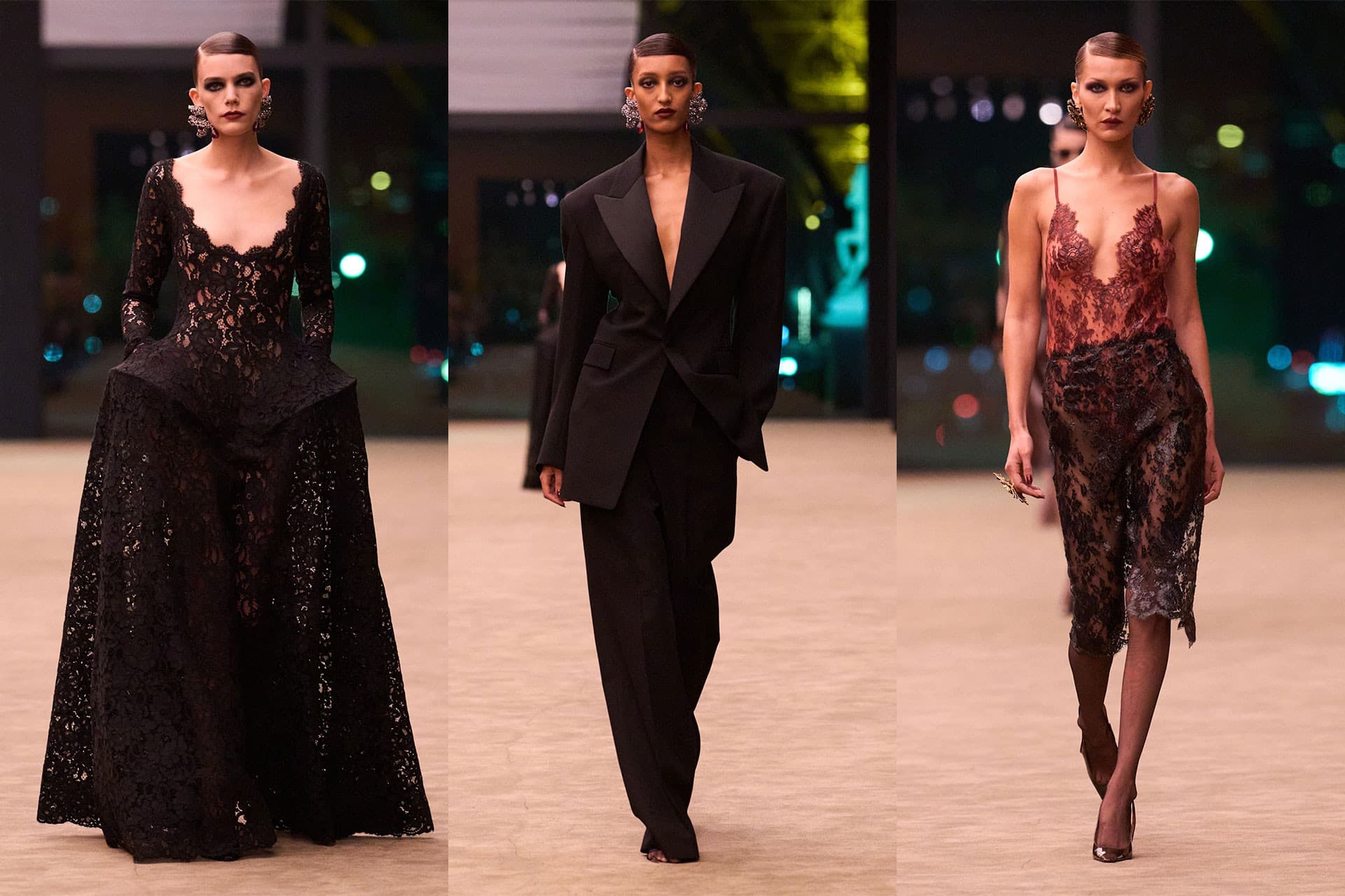 LaunchmetricsThe distinctly evening portion of the collection returns to black. The famous Le Smoking jacket is loosened again, and intercepted by tightly tailored black lace dresses. Two especially great looks were the two duplicate lace gowns (only with slightly different necklines) with pannier skirts. There is a sense of intimacy here, offered in these tiny sheer looks and in the louche suiting. It is sexy, yes, but in an inherently Parisian way. Glamorous, sure, but perhaps not by traditional definition. This skirting of norms was a sentiment that Vaccarello resonated with via the seminal writing in Gore Vidal’s novel, The City and the Pillar, a transgressive (at the time) story about queer love and gay subculture. There are moments here where that feeling carries through, via dark makeup and a show track created by SebastiAn, who intercepts classical string music with techy club tracks, offering an emotional reaction, of sorts, to the cinematic nature of Vaccarello’s collections at Saint Laurent.