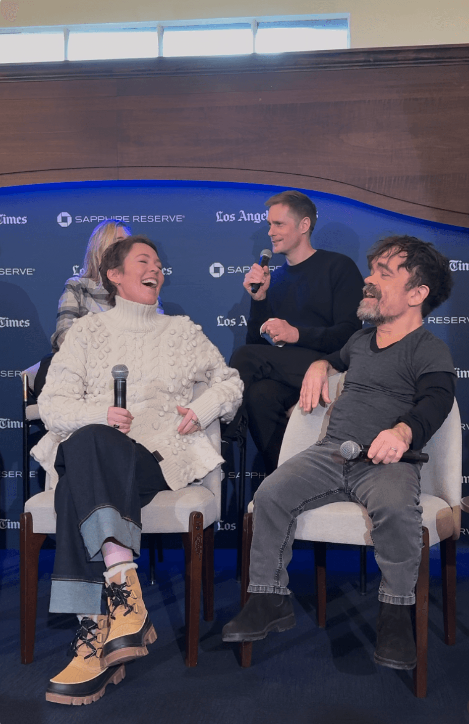 On the first day, with my (snow) boots on the ground, I attended a panel with Olivia Colman, Alexander Skarsgård, Elizabeth Debicki, and Peter Dinklage (dream blunt rotation? I think yes), celebrating their new film, Wicker, at the Chase Sapphire Reserve Experience. And yes, before you ask, Alexander Skarsgård is exactly what you’d expect…I was squealing in my seat! Beyond obsessed! I found myself spending a majority of the weekend at Chase's lounge, either listening to panels or popping in to recharge between events (the hub had a super convenient Main Street location). During the day, the space served complimentary bites (served late morning through mid-afternoon), as well as coffee and hot cocoa. By night, it transformed into a full-blown party hub, hosting coveted, star-studded cast parties—more on that later.
