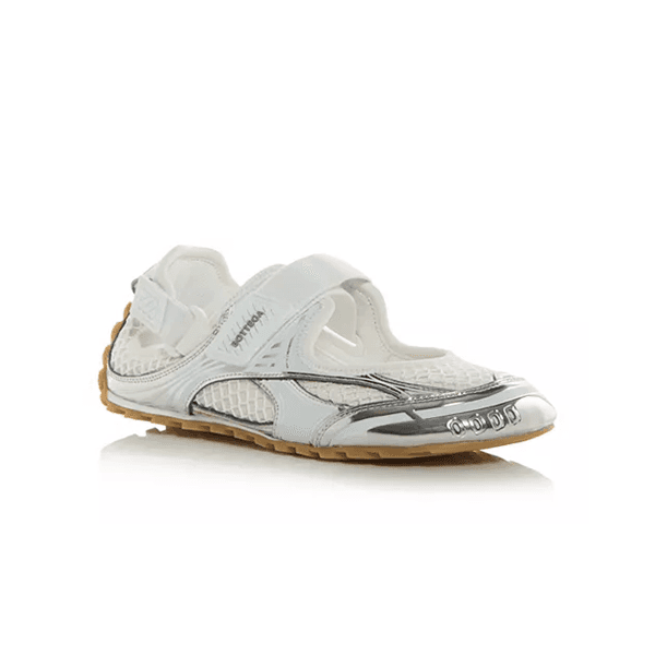 On Simone Rocha's Fall/Winter 2026 runway, pink ballet sneakers were adorned with silver embellishments and complete with red ribbon, perfectly matching the ribbon on the dress that they were paired with. Last season, Prada introduced a more subtle and simple pair on their Spring/Summer 2026 runway: a silver satin pair that perfectly matched the thin, no frill ballet flat silhouette with the lace-up details of a sneaker.