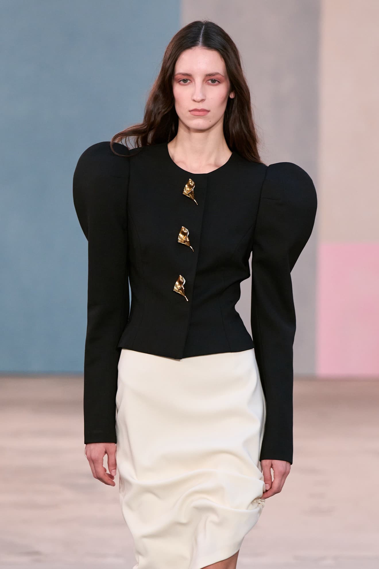 Khaite Fall/Winter 2026 LaunchmetricsCarolina Herrera's Fall/Winter 2026 show was filled with buttons that transcended functionality. They were anything but subtle and, instead, worked as accessories. A knit cardigan with dramatic puffed sleeves closed with gold calla lily buttons that emulated brooches and made a similar statement. A black blazer-style jacket was contrasted with oversized pearly white buttons creating a dark versus light dynamic. This is proof that even the most traditional of closures can be reinterpreted and hold the power to completely change a piece of clothing.